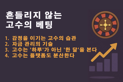 • · 장기적 계획 수립 : 단기적인 승리에 연연하지 않고 장기적인 관점에서 베팅 전략을 구축합니다.