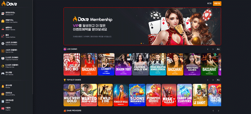 메인 페이지 디자인은 어두운 배경에 선명한 색 대비를 주어 정보 전달력을 높이고, 시각적 피로를 줄여 장시간 이용에도 쾌적함을 유지할 수 있도록 설계되었습니다. 좌측 사이드바에는 라이브 카지노, 호텔카지노, 슬롯머신, 홀덤, 스포츠, e스포츠 등 주요 메뉴가 직관적으로 배치되어 있으며, 상단에는 VIP 멤버십과 주요 이벤트 배너가 위치해 있습니다. 이러한 구조는 초보자부터 고급 이용자까지 모두 빠르게 원하는 기능에 접근하도록 돕습니다.