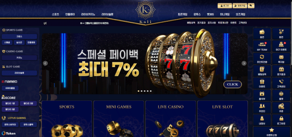칼리(Kali)는 **스포츠·인플레이·라이브카지노·라이브슬롯·미니게임**을 한 화면에 배치한 네이비·골드 콘셉트의 통합형 브랜드다. 운영 철학은 **명확한 보상 산식과 전등급 접근성**으로, 기본 등급(1Lv)부터 핵심 이벤트에 참여 가능하도록 설계했다. 스페셜 페이백(최대 7%)과 카테고리별 충전 보너스(스포츠/미니 첫충 10%·매충 5%, 카지노 첫충/매충 5%)가 핵심 기둥이며, 미니게임은 콤프(Comp) 최대 1.2% 적립을 제공한다.