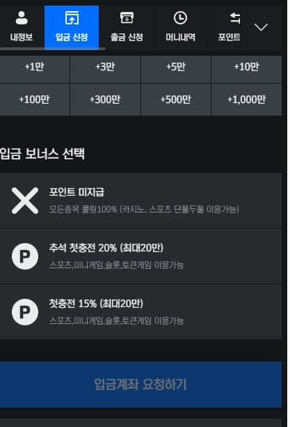 • · 포인트 적립 및 캐시백 시스템 : 베팅 금액의 일정 비율을 포인트로 적립할 수 있으며, 누적된 포인트는 현금 또는 베팅 크레딧으로 전환이 가능합니다. 또한, 일정 손실 금액을 기준으로 자동 캐시백이 적용되어 지속적인 플레이를 지원합니다.