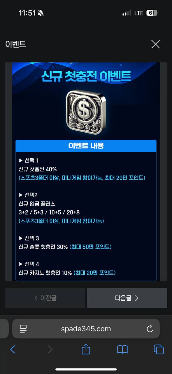 - 신규 가입 보너스, 첫 충전 보너스, 출석 이벤트, 페이백 이벤트 등 다양한 혜택이 제공됩니다.